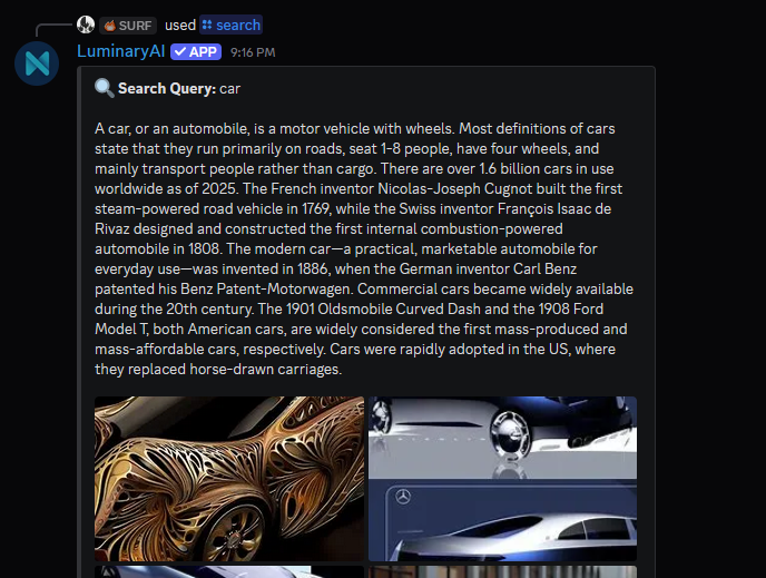 LuminaryAI is an AI-powered Discord bot with the ability to generate stunning, clear images, question answering, deep web searching etc. Currently serving over 17,000 users, it's officially verified as well.